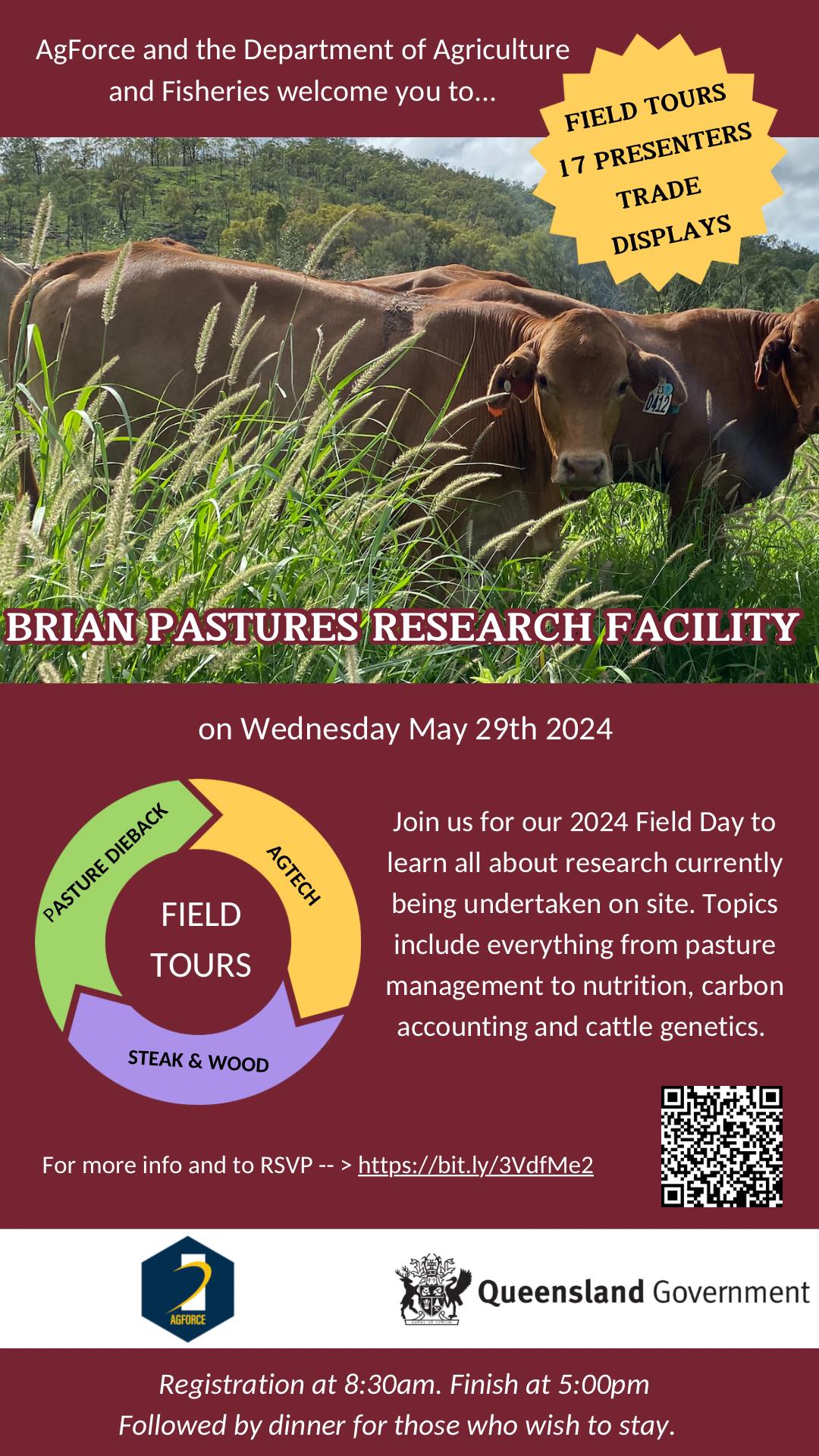The Department of Agriculture and Fisheries and AgForce welcomes you to the Brian Pastures Research Facility Field Day on May 29th 2024.