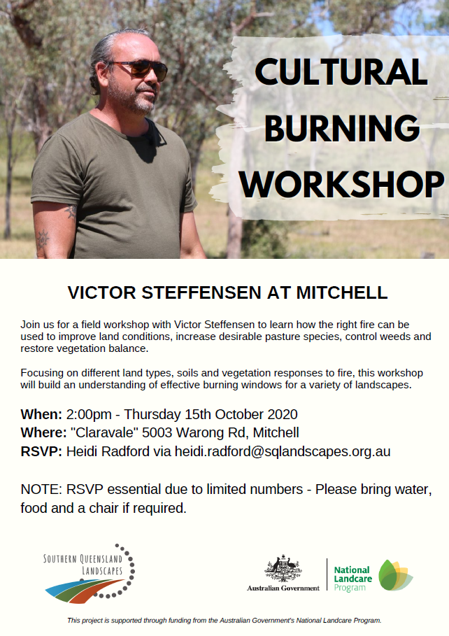 Join SQ Landscapes for the Cultural burning workshop with Victor Steffensen at Mitchell, to learn how the right fire can be used to improve land condition, increase desirable pasture species, control weeds and restore vegetation balance.