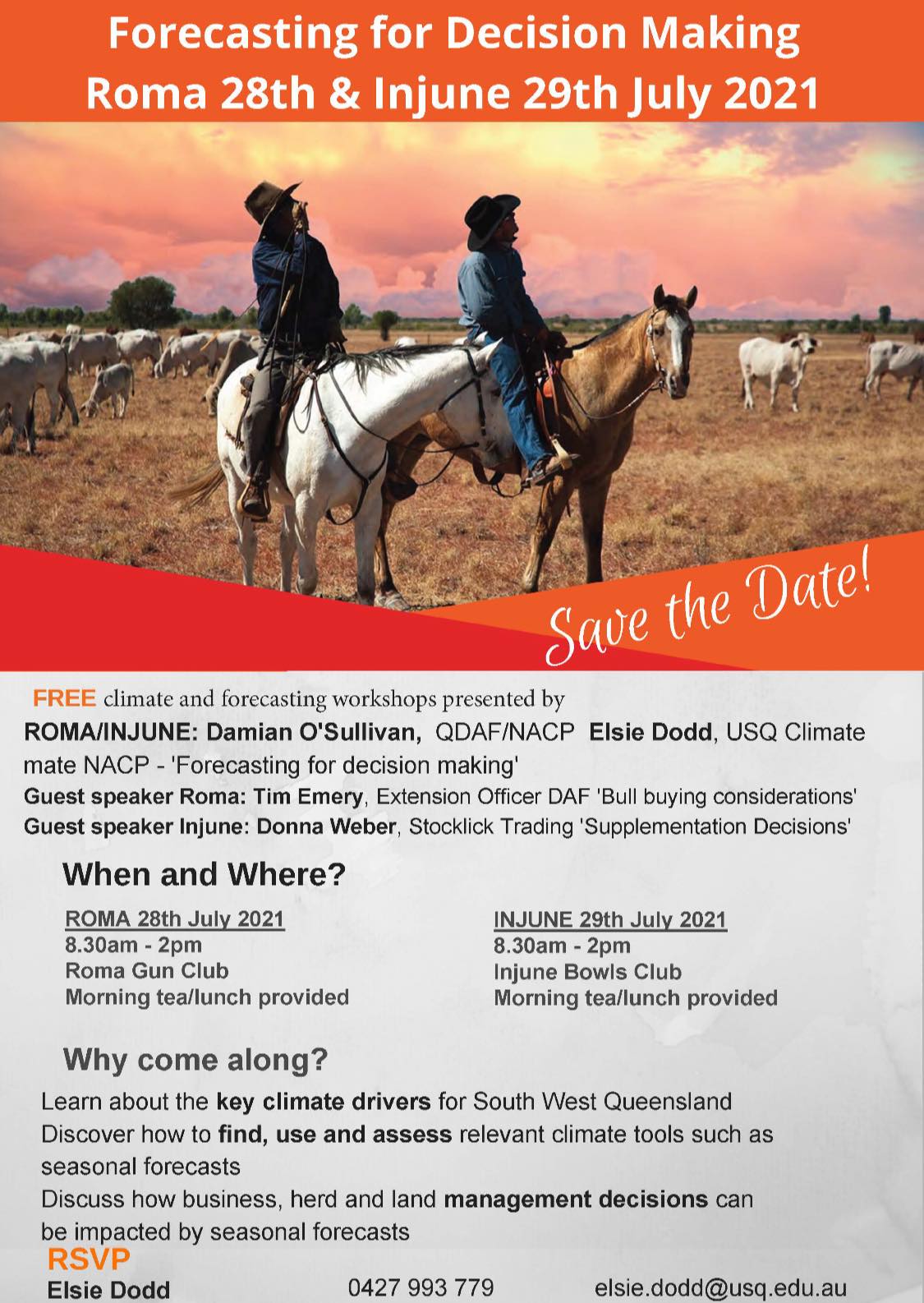 Join Elsie Dodd, USQ Climate Mate, Damien O’Sullivan and Tim Emery, Department of Agriculture and Fisheries Extension Officers, and Donna Weber from Stocklick Trading for a free workshop in Roma.