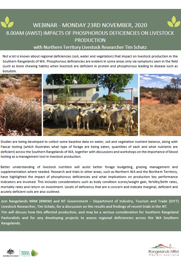 Rangelands NRM has teamed up with Tim Schatz, Principal Pastoral Production Research Officer with the Northern Territory Department of Industry, Tourism and Trade (DITT), to host a webinar investigating the impacts of phosphorus deficiency on livestock production.