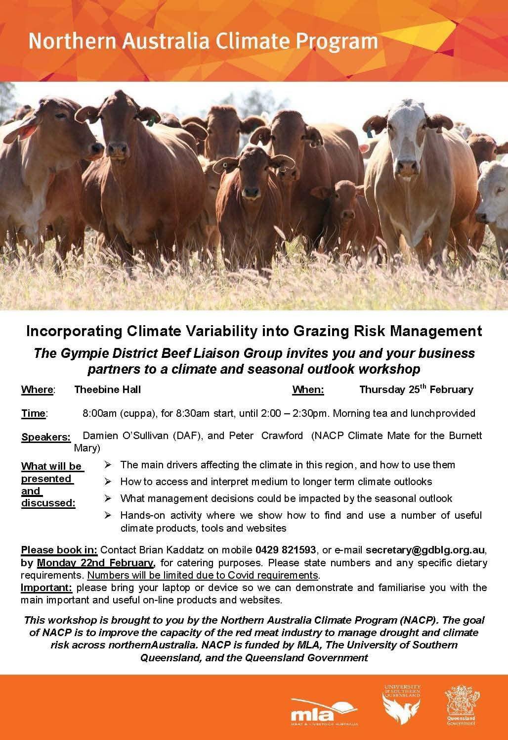 The Gympie District Beef Liaison Group invites you to a climate variability and seasonal outlook workshop at Theebine Hall on 25 February starting at 8 am.