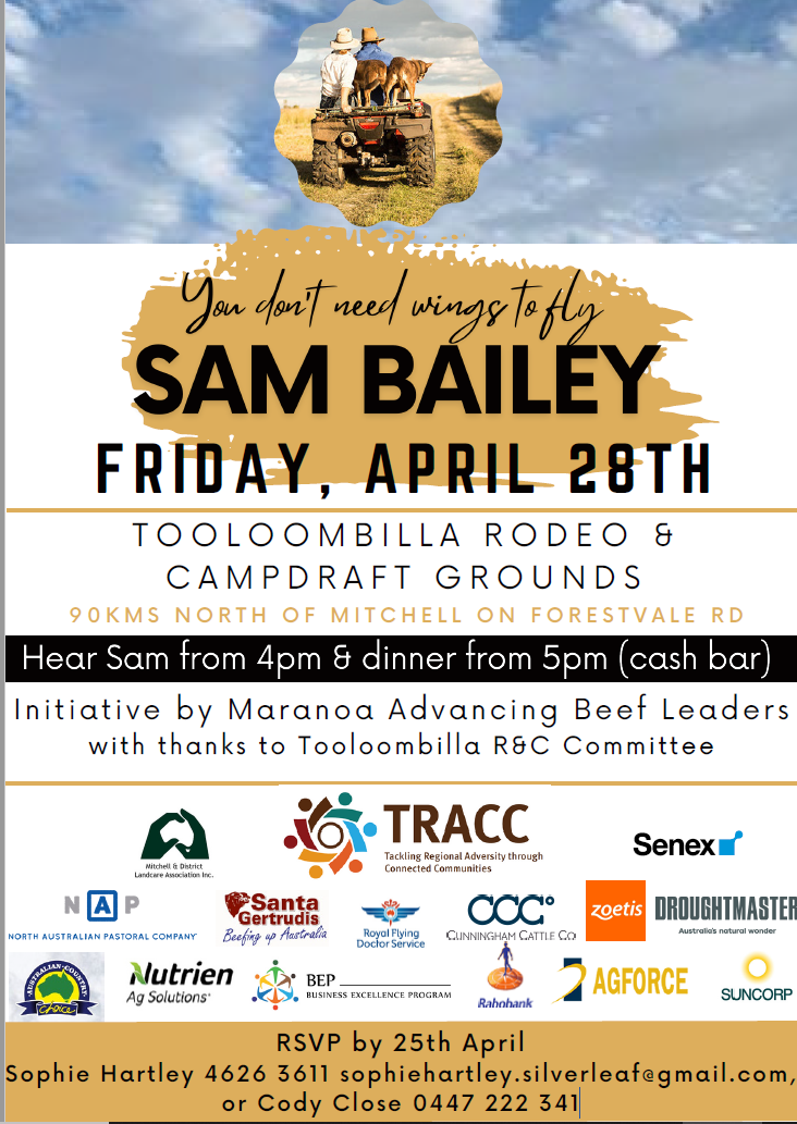 The Maranoa Advancing Beef Leaders group proudly presents Sam Bailey at the Tooloombilla Rodeo and Campdraft grounds.