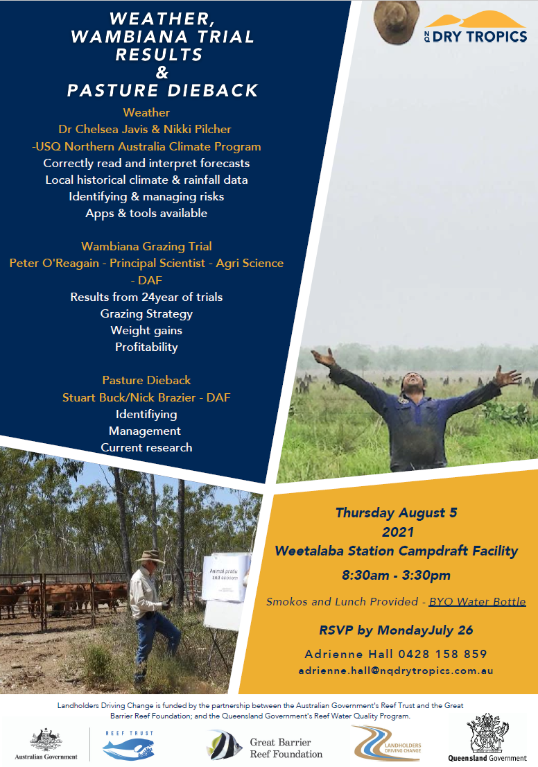 NQ Dry Topics and Queensland Department of Agriculture and Fisheries invites you to Weather, Wambiana trial results & pasture dieback at Weetalaba Campdraft Facility on Thursday, 5 August.