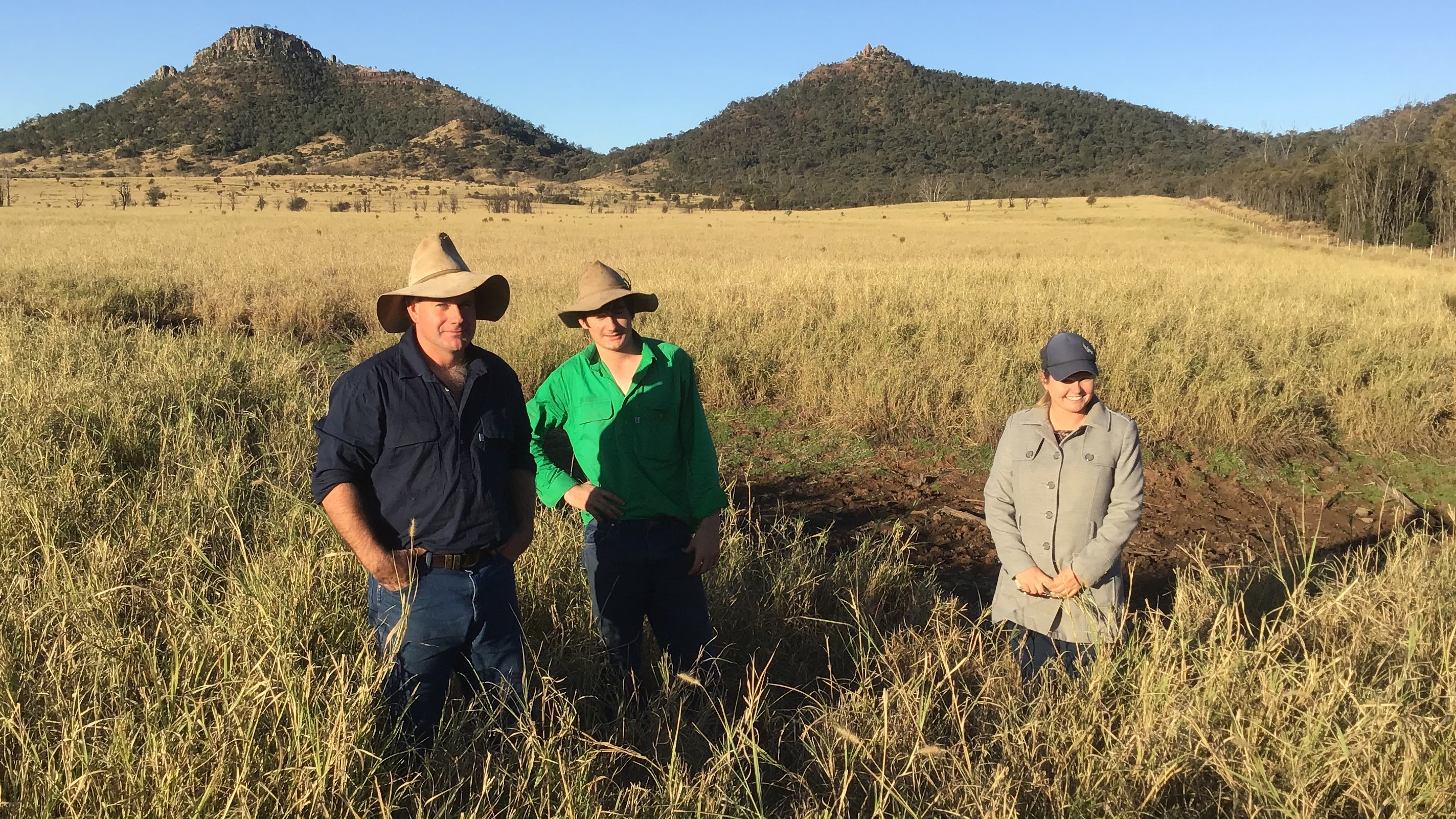 Carbon neutral objective - owners (men in hats) stand in a paddock of buffel grass with technical officer.