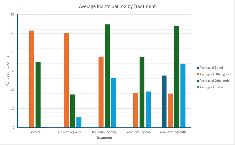 The site was planted on 26 February 2025. The Yeoman’s ripping was undertaken a few days before and was just a single pass. The spraying of RoundUp (4 L/ha) was done the same day as planting, as the existing vegetation on the site was green and growing. Stylo treatments were planted with a mix of 85% shrubby and 15% caatinga stylo at a total rate of 3.9 kg/ha. The stylos + buffel plots were also planted with coated Gayndah buffel at 31.2 kg/ha. Single super-phosphate fertiliser was applied at 239 kg/ha to address the low phosphorus, sulfur and calcium levels in the soil.