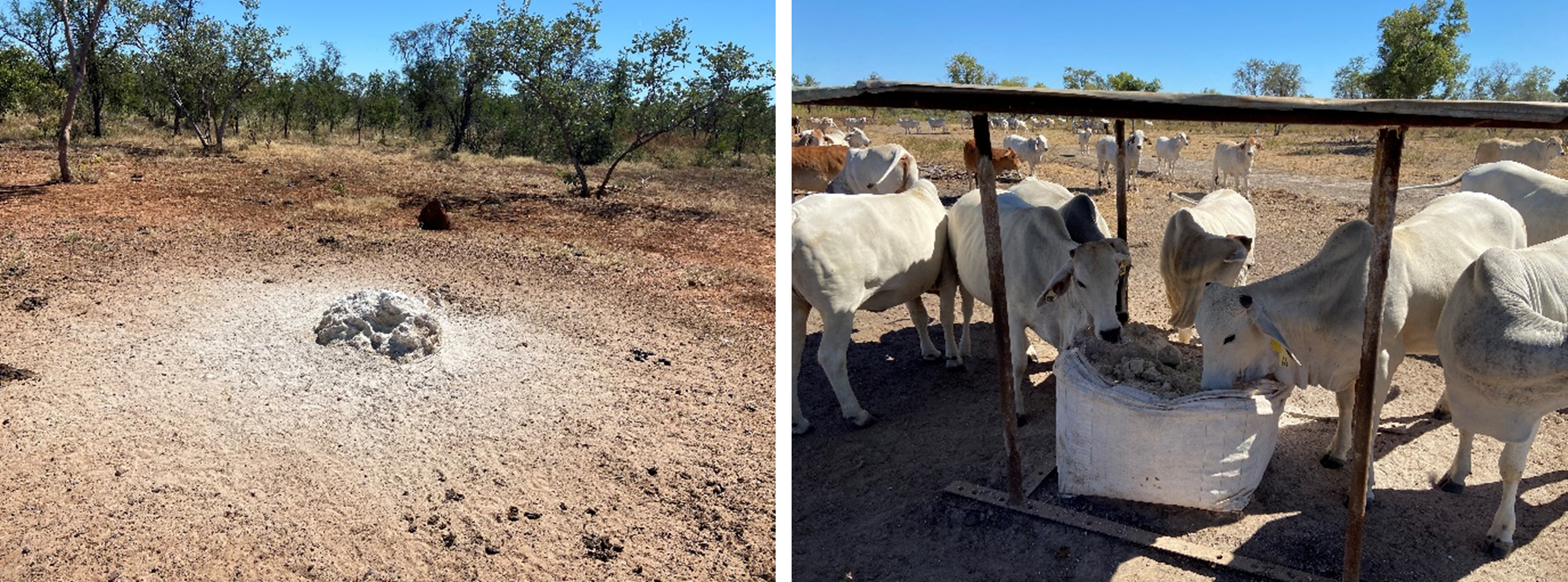 The effect of sheltering the lick from rainfall was observed during the 2020/21 wet season. One bulk bag was placed in the open (uncovered), 2.6km from the trough; and the other under a shelter close to the water trough. After 5 months (13/05/21), the P concentration of the supplement at both sites was similar, however; there was a lot less lick left at the uncovered site. This was unexpected as the cattle were known to spend more time near the covered lick. It appeared that more of the uncovered lick had dissolved and leached into the soil creating an area of white residue around the bag.