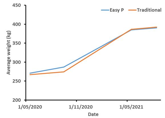 Early indications from this project are that the Easy P treatment is an effective method of supplementing breeders with P. The performance of heifers receiving the Easy P treatment is similar to that of heifers receiving traditional P supplementation. The VRRS trial will continue until 2025.